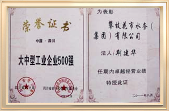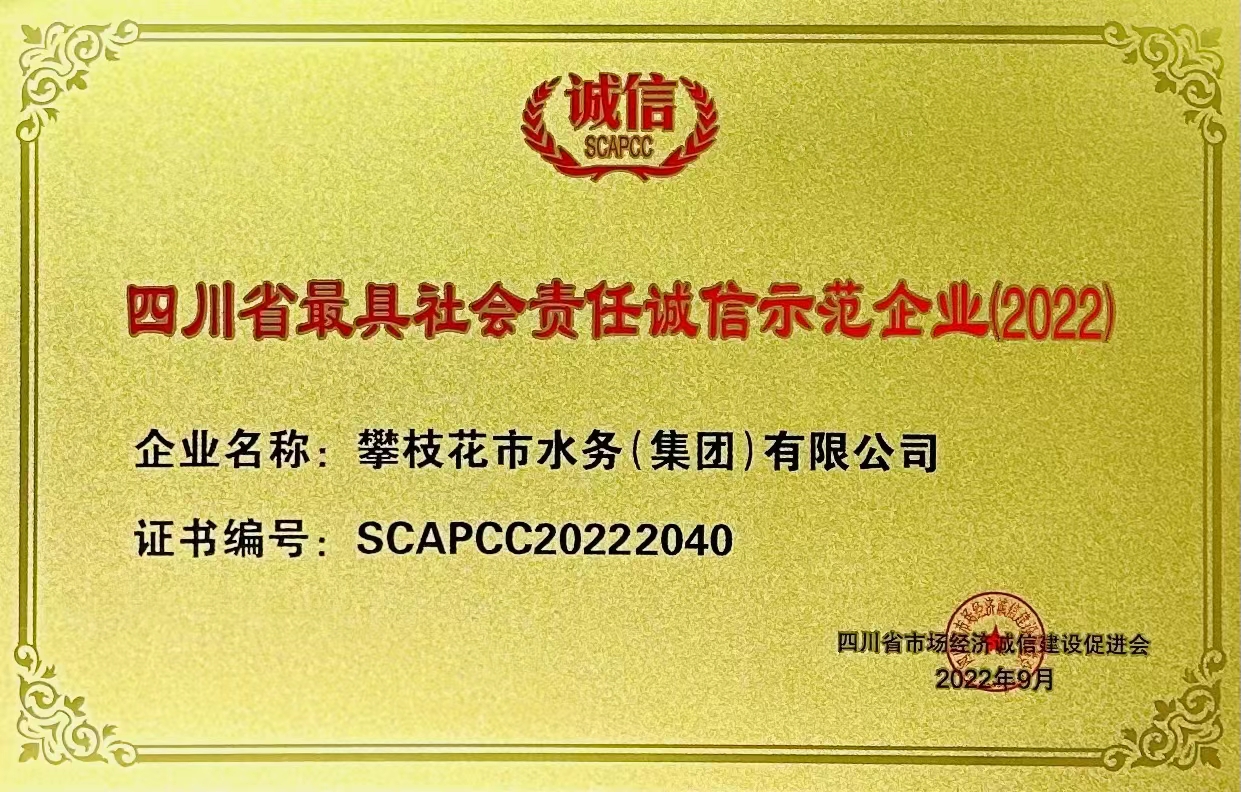先后榮獲了全國模范勞動關(guān)系和諧企業(yè)、全國“五一"勞動獎狀、全國“安康杯競賽活動優(yōu)勝單位"、中國供水排水行業(yè)突出質(zhì)獻(xiàn)單位獎、全國模范職工之家、國家建設(shè)部精神文明建設(shè)先進(jìn)單位、發(fā)揚(yáng)“水之魂”精神為震后重建再立新功、四川省“五一”勞動獎狀、四川省誠信示范單位、四川省先進(jìn)企業(yè)、四川省大中型工業(yè)企業(yè)500強(qiáng)、四川省水的生產(chǎn)和供應(yīng)最效益十強(qiáng)最大規(guī)模十強(qiáng),攀枝花市企業(yè)50強(qiáng),攀枝花市A級納稅單位等數(shù)十項帶譽(yù)稱號。
