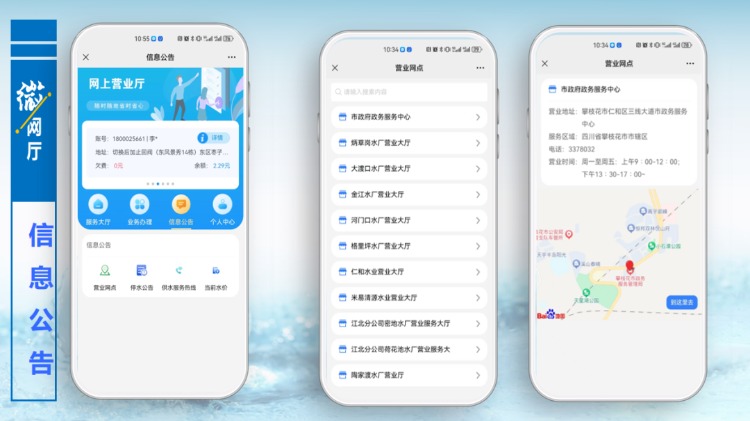 新年伊始,攀枝花市水務(wù)集團(tuán)便民服務(wù)再添新舉措,“微信營(yíng)業(yè)廳”(以下簡(jiǎn)稱(chēng)“微網(wǎng)廳”)正式開(kāi)通運(yùn)行,用戶(hù)只需關(guān)注二維碼,動(dòng)動(dòng)手指就可以在“微信營(yíng)業(yè)廳”辦理水費(fèi)繳納、用水報(bào)裝、更名過(guò)戶(hù)、信息查詢(xún)等各項(xiàng)用水業(yè)務(wù),為您提供更加專(zhuān)業(yè)、高效的優(yōu)質(zhì)服務(wù),實(shí)現(xiàn)辦事“免跑腿”、溝通“零距離”。下面,跟隨小編一起去看看“微網(wǎng)廳”的操作流程吧!